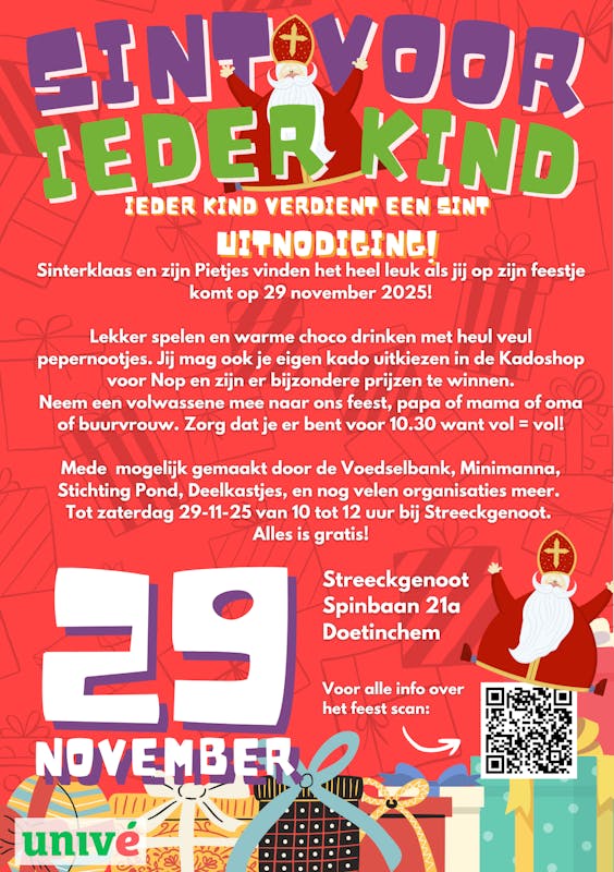 Uitnodiging voor het grote Sint voor Ieder Kind feest. Alle kinderen verdienen een Sinterklaasfeest. Er zijn spelletjes, warme chocomelk en heel veel kadootjes, klein en groot. Sinterklaas en Pietjes zijn er ook en alles maar dan ook echt alles is gratis. Jij hoeft alleen maar goeie zin te hebben dan wordt het een spetterend feest!